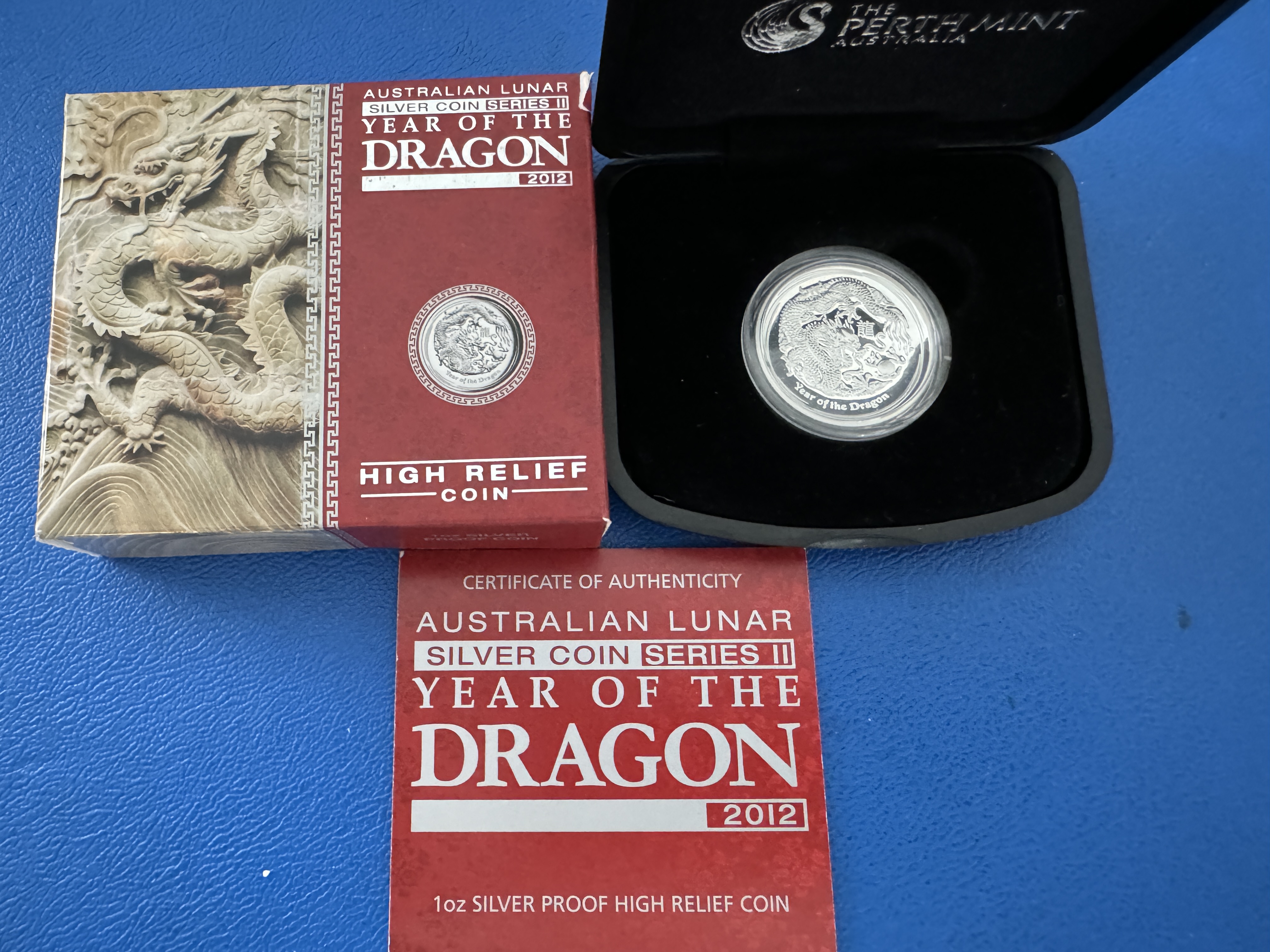 1 Oz 2012 Drache Lunar II High Relief Silber in Polierte Platte inkl. Etui und Zertfikat