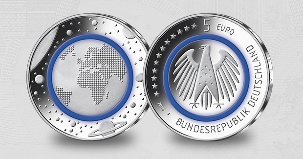 erstmalige Kombination von Metallkomponenten und Kunststoff – eine Welt-Neuheit im Münzbereich. Diese innovative Münze ist das Ergebnis einer im Jahr 2006 begonnenen Entwicklung. Es handelt sich um eine dreiteilige Münze, die aus einem inneren metallischen Kern, einem metallischen Ring und einem prägbaren Kunststoffring besteht. Der zwischen den Metallkomponenten eingefügte, im Gegenlicht blau leuchtende Polymerring verbindet die Metalle dauerhaft miteinander und setzt gleichzeitig in beindruckender Weise das Thema der Münze „Planet Erde“ um.
