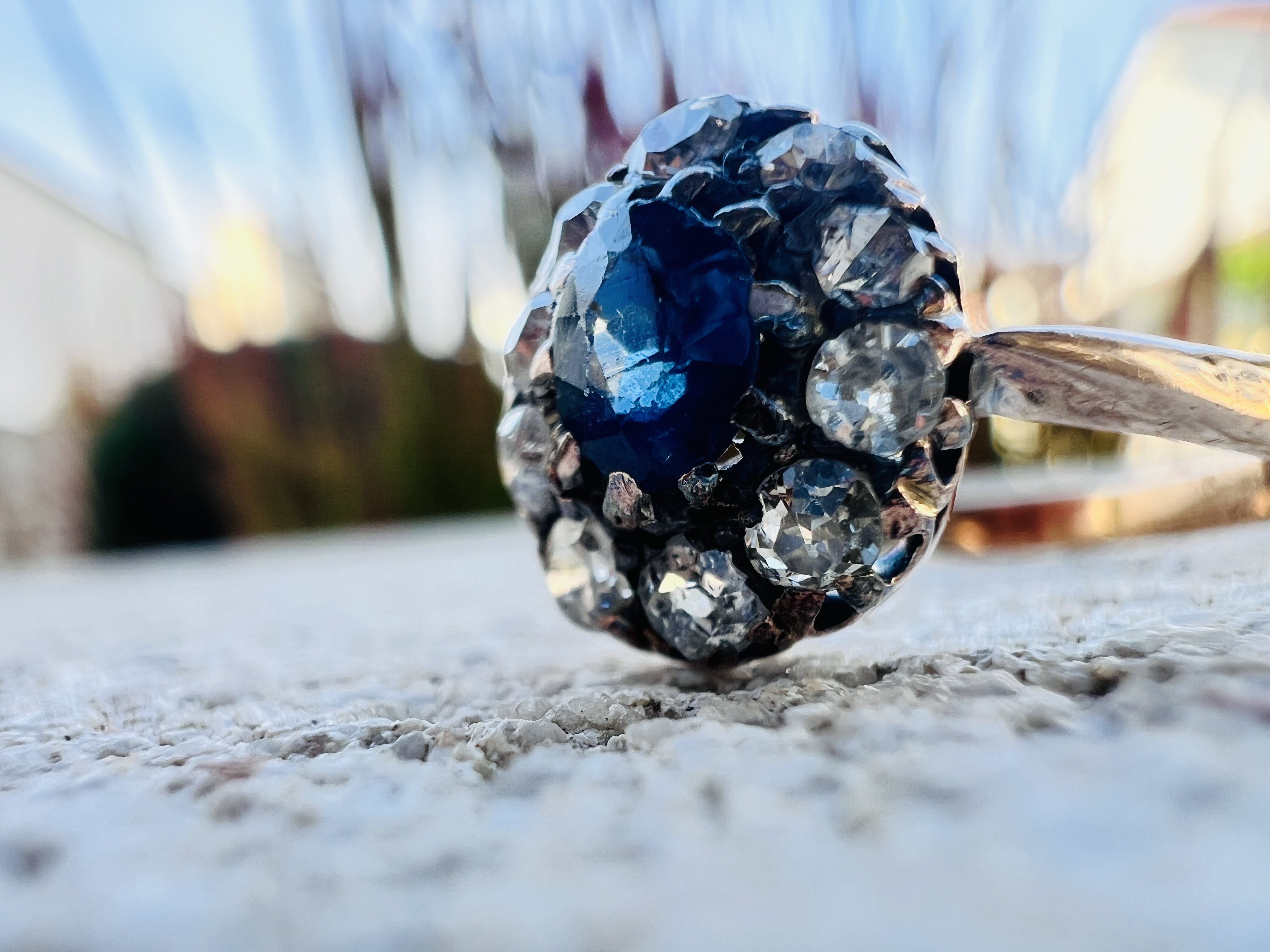 Alle Steine sind vollständig erhalten und zeigen einen lebendigen, warmen Glanz, der den historischen Charakter dieses Schmuckstücks eindrucksvoll unterstreicht. Die Kombination aus intensivem Blau und dem sanften Funkeln der Diamanten verleiht dem Ring eine elegante Ausstrahlung und macht ihn zu einem zeitlosen Blickfang.