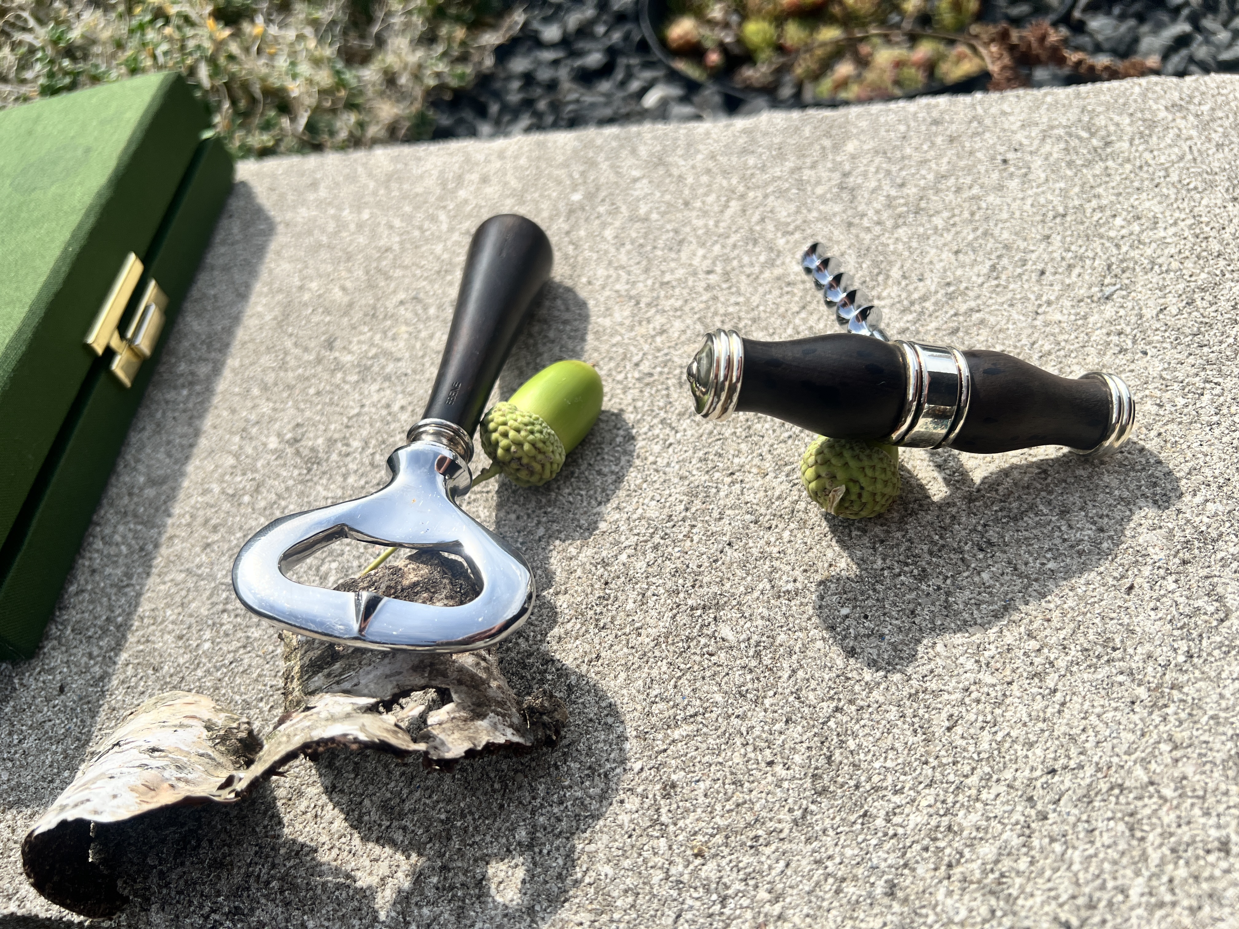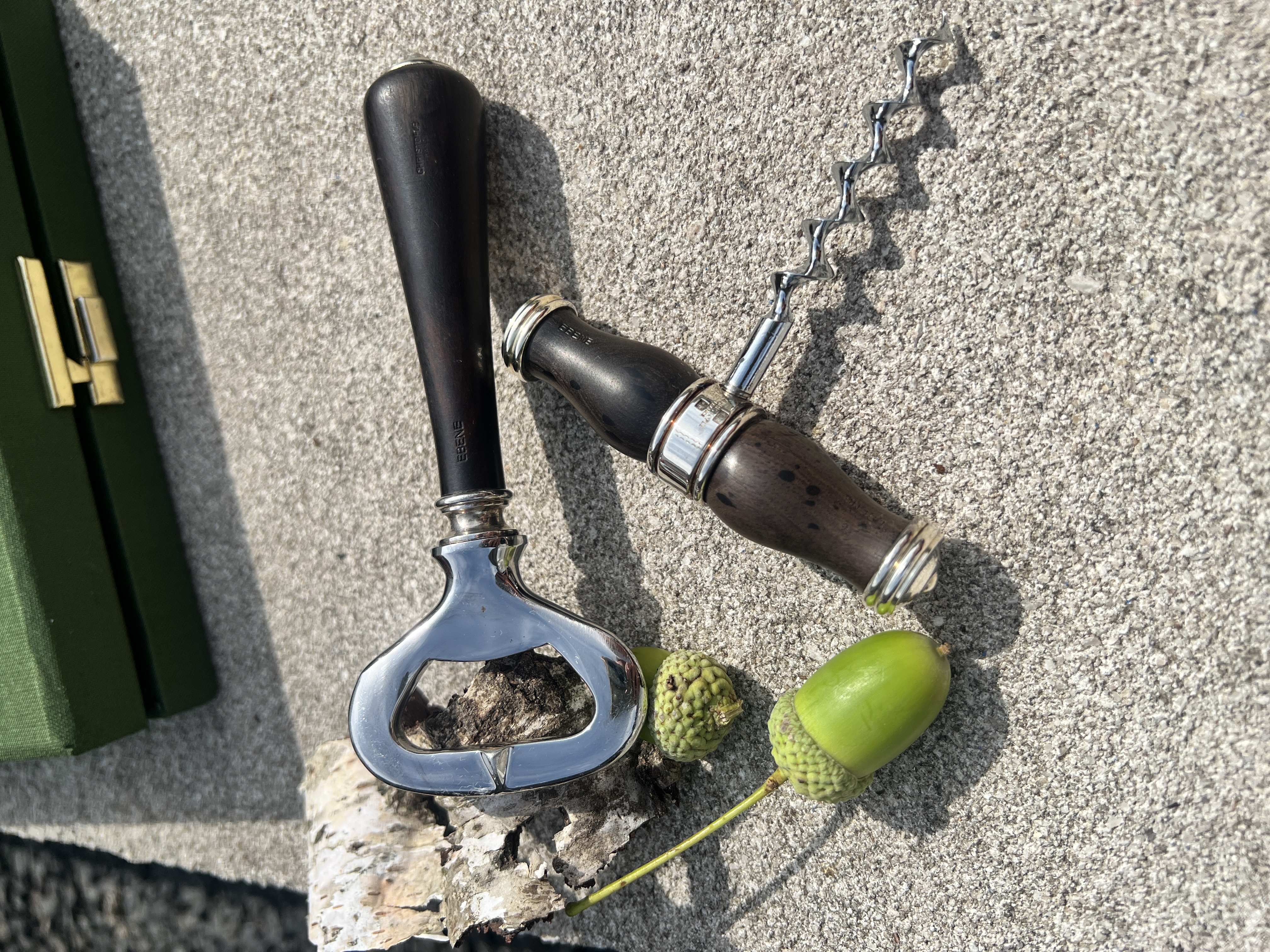 Die Griffe aus feinem Ebenholz liegen angenehm in der Hand und werden durch kunstvoll gearbeitete, versilberte Metallapplikationen ergänzt. Der Korkenzieher überzeugt durch seine präzise Mechanik und sichere Führung, während der Flaschenöffner mit klarer Linienführung und perfekter Balance als stilvolles Barutensil dient.