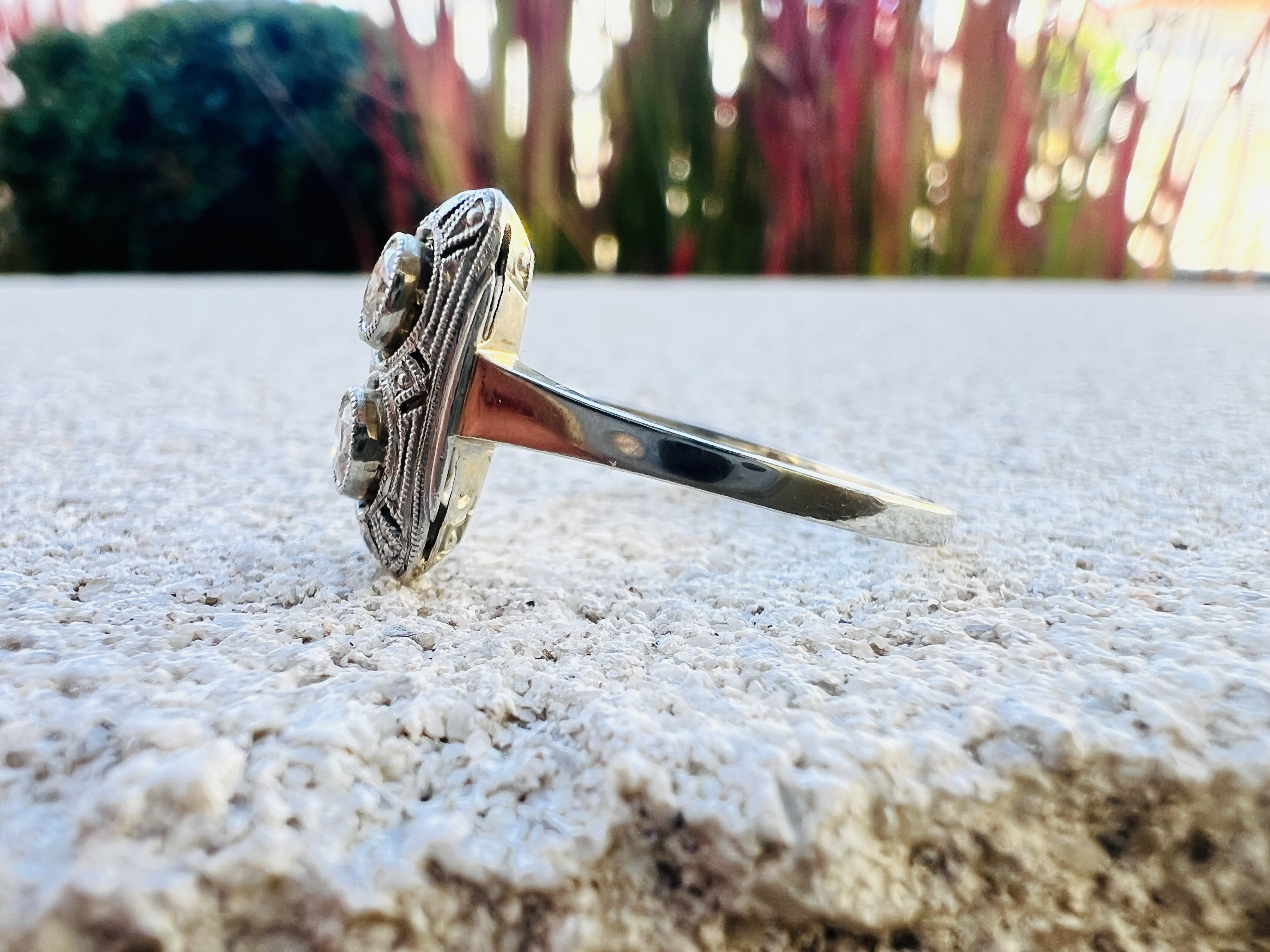 Die harmonische Verbindung aus präziser Handarbeit, klassischer Linienführung und hochwertigem Diamantbesatz macht diesen Ring zu einem stilvollen Schmuckstück mit unverkennbarem Art-Déco-Charakter – zeitlos, elegant und zugleich ausdrucksstark.
