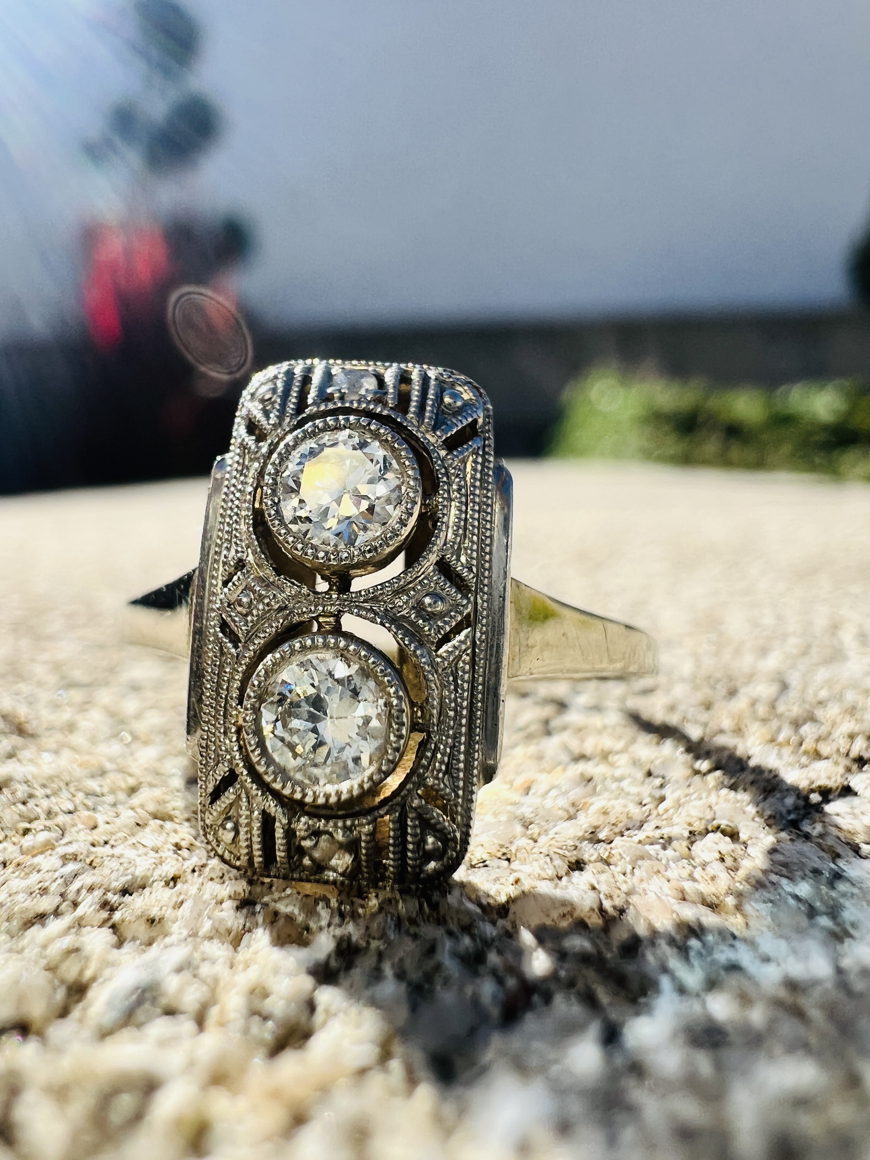 Das markante Design besticht durch seine rechteckige Front mit feinen Millgriffé-Verzierungen und klaren geometrischen Ornamenten. Im Zentrum funkeln zwei runde Brillanten, die in edler Zargenfassung gehalten sind und dem Ring eine elegante, ausdrucksstarke Strahlkraft verleihen.